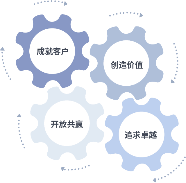 成就客户是一切决策的出发点,,,,创造价值是衡量所有工作的标准,,,,追求卓越是我们做事做人的态度,,开放共赢是我们的格局也是最终的结果。。价值观的齿轮环环相扣,,,,推动着组织里的每个人不断向前。。。。