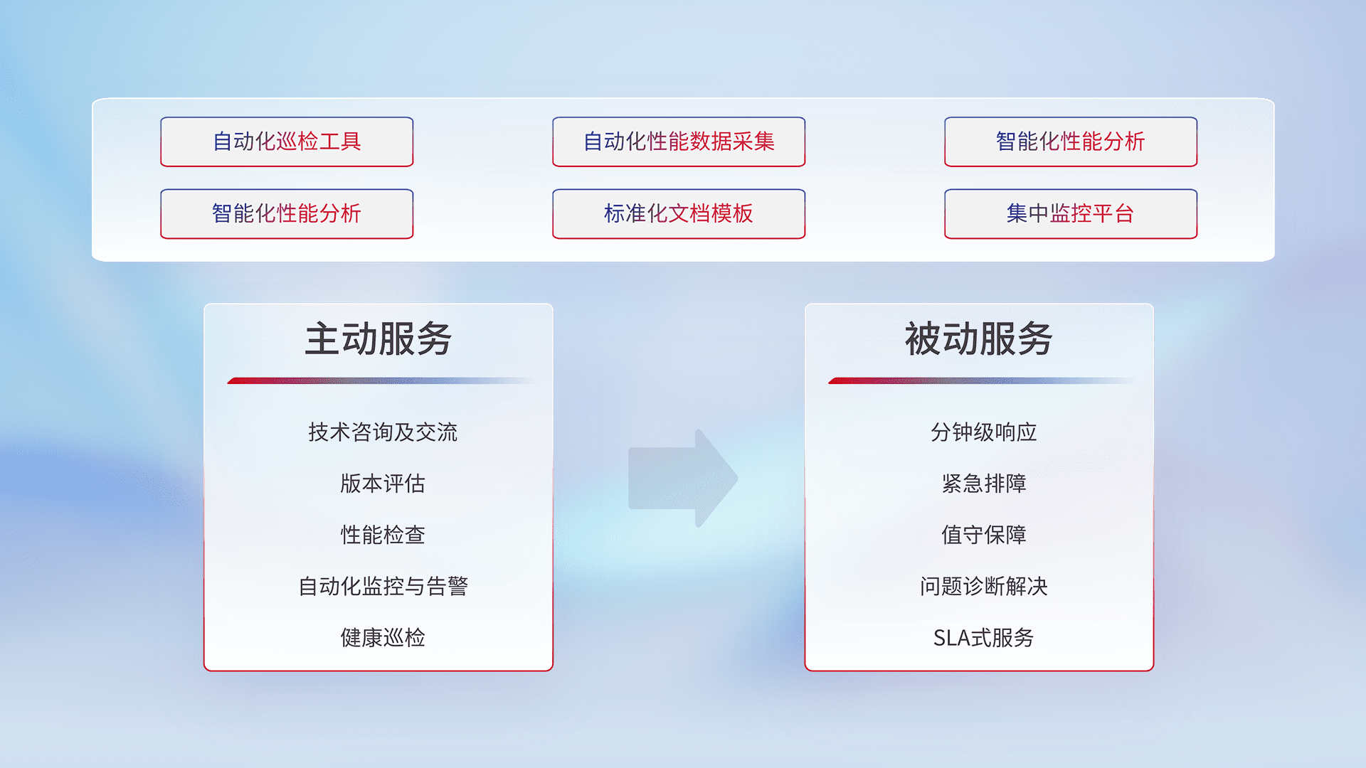 智能化工具和标准化文档,,保障服务质量,,,提供主动服务(包含技术咨询、、版本评估、、、、性能检查、、、自动化监控与告警、、、、健康巡检)和被动服务包含(分钟级响应、、紧急排障、、值守保障、、、问题诊断解决、、SLA服务)。。。。